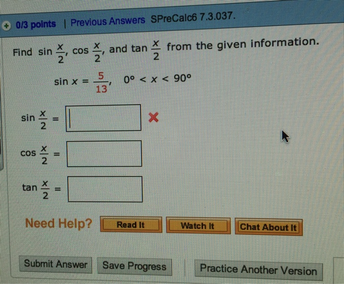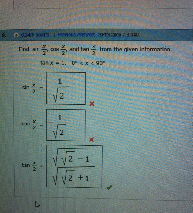 Solved: The Value Of Sin X Is Given. Find Cos X And Tan X ... from media.cheggcdn.com Hope this may help you… \int \cos {x}\sin {x} \, dx ∫ cosxsinxdx. Input the value of x angle for sin (x) and cos (x) apply the formulas given for sin (x) and cos (x) print the result. That sin^2theta +cos^2theta =1 therefore if we know sin. You can also show that this is equivalent to the other two answers using the identity cos(2x) = cos2(x) − sin2(x). Apr 26, 2012 · find sin 2x, cos 2x, and tan 2x from the given information.find sin 2x, cos 2x, and tan 2x from the given information. Approach used in the below program is as follows −. When given that sin(x)=3/5 and that x is an acute angle, find the value of cos(x)to approach this problem it will be easier to first draw a diagram to help i.