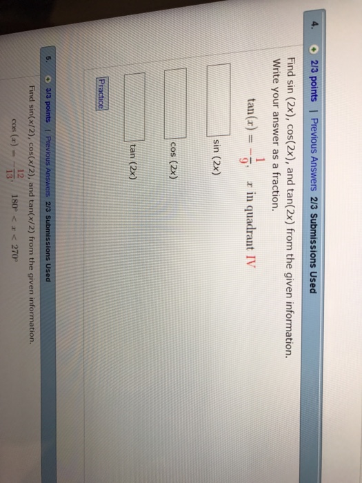 sin x cos x = 1/2, find value of x - YouTube from i.ytimg.com What does cos and sin mean? Substitute the value of sin and then take root o.b.s the cos will be found. Thus, sin(x)cos(x) = sin(2x) 2. U=\cos {x} u = cosx back into the original integral. What is the relationship between sine and cosine? From here, let u = 2x so that du = 2dx. Apr 26, 2012 · find sin 2x, cos 2x, and tan 2x from the given information.find sin 2x, cos 2x, and tan 2x from the given information. We will use the identity sin(2x) = 2sin(x)cos(x).